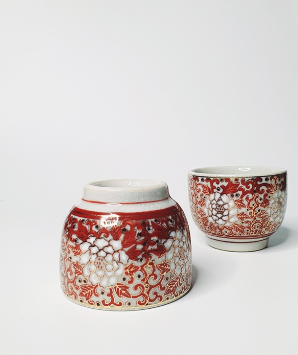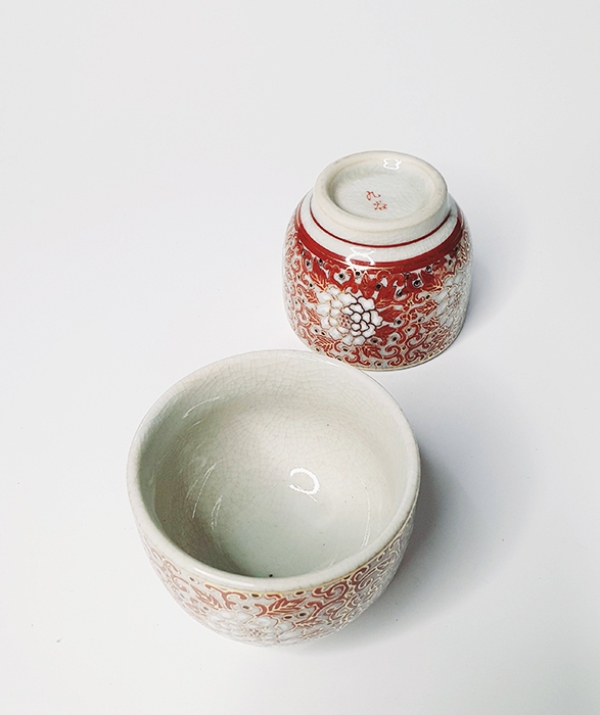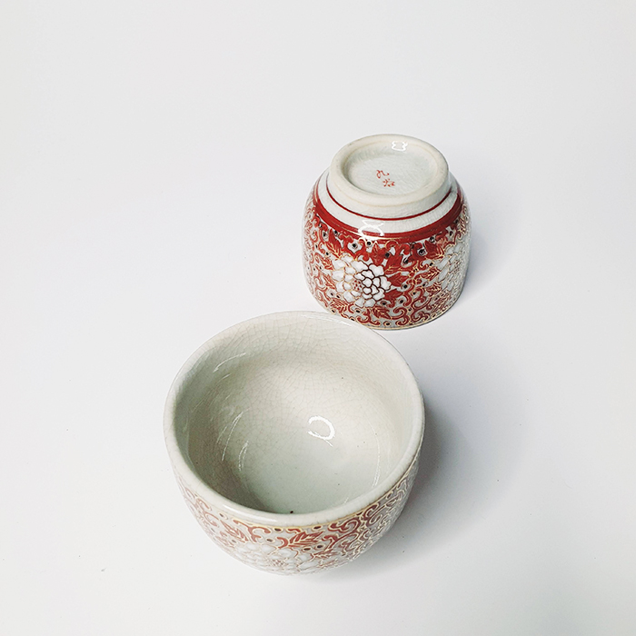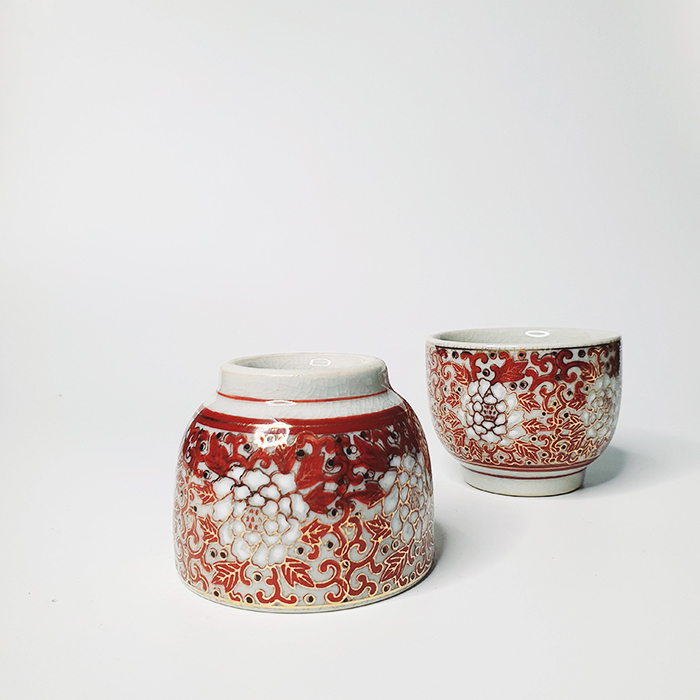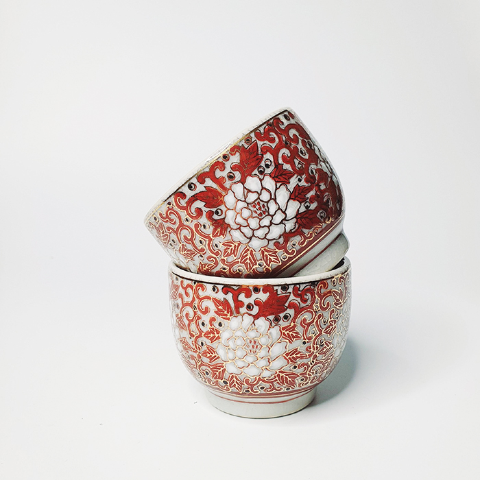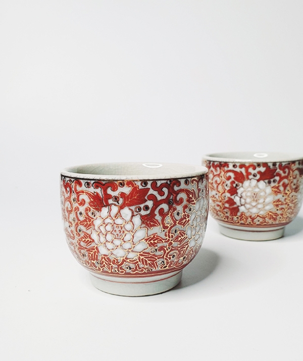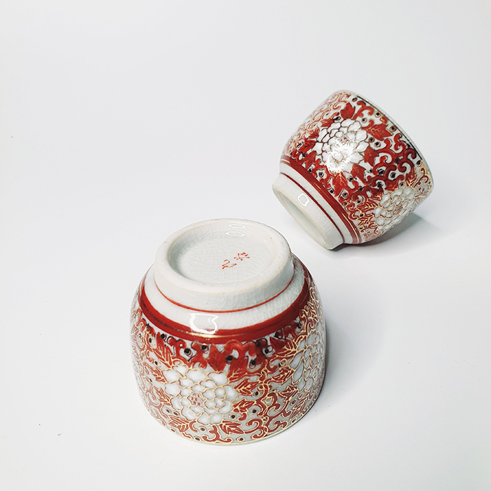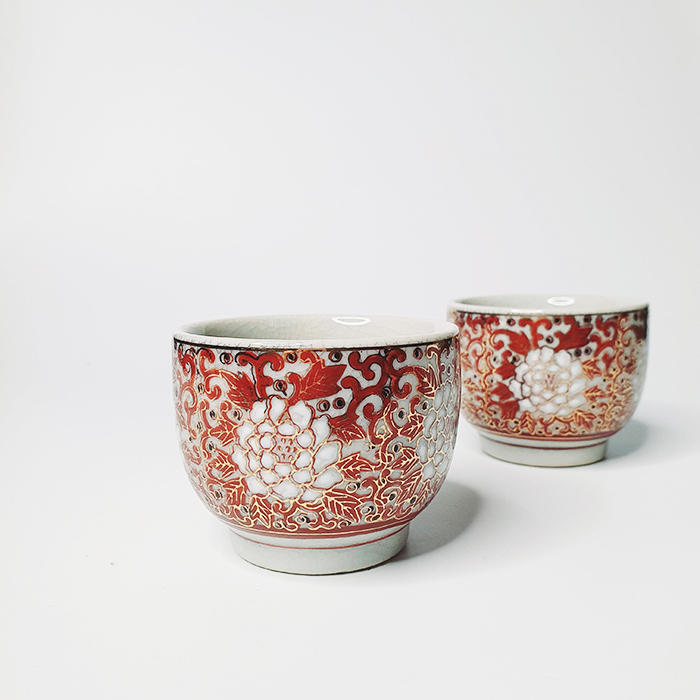 Cặp ly gốm Kutani vẽ hoa đỏ nhũ vàng rất đẹp của Nhật