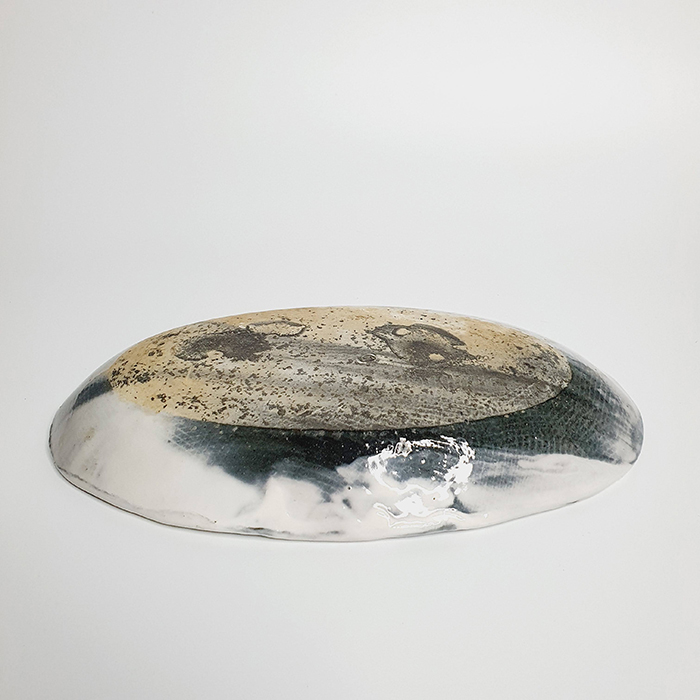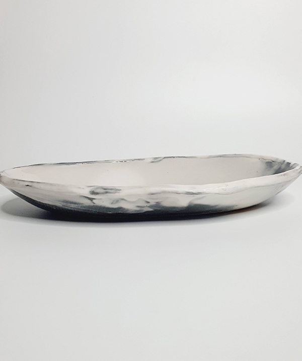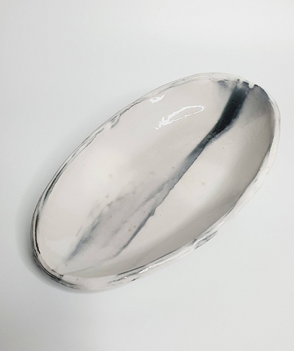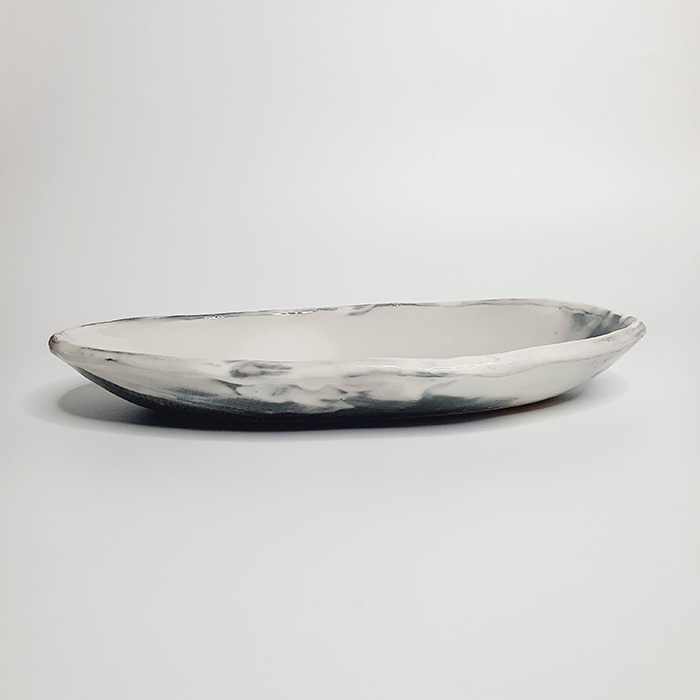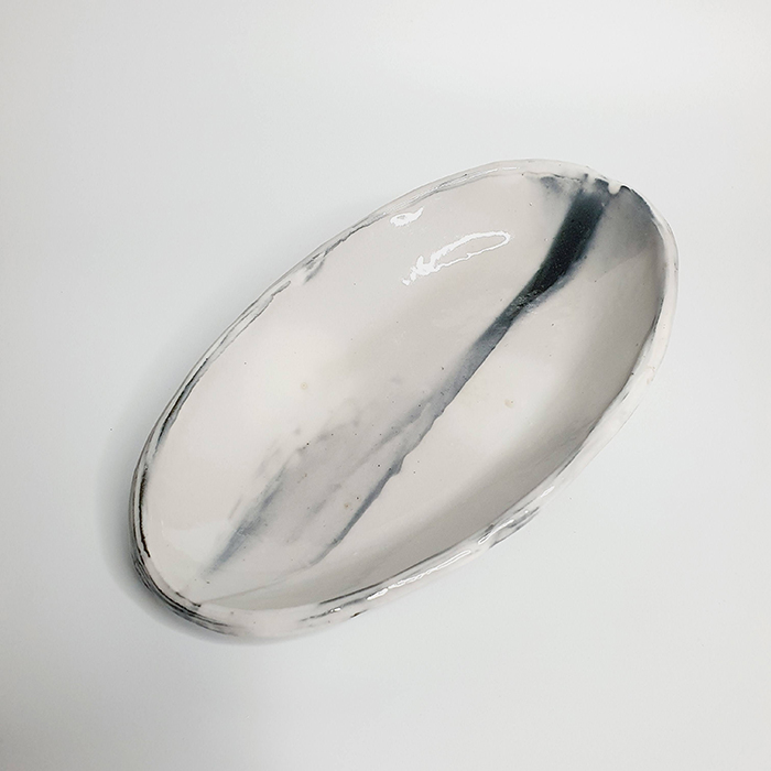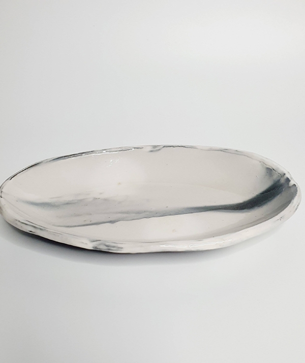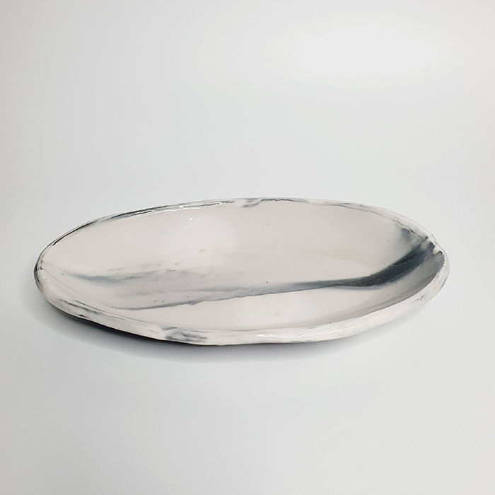 Dĩa gốm mộc dáng thuyền phủ men trắng xám.