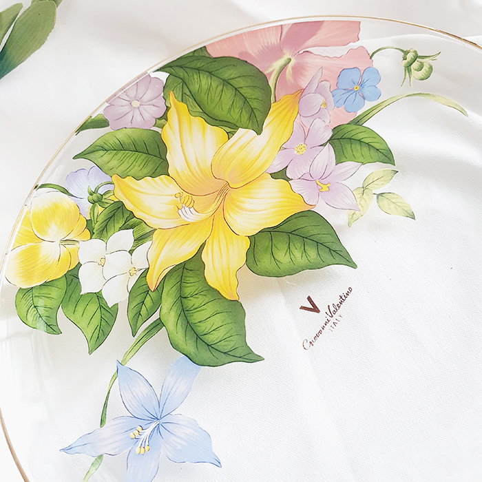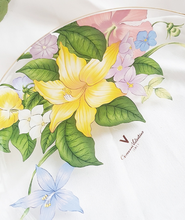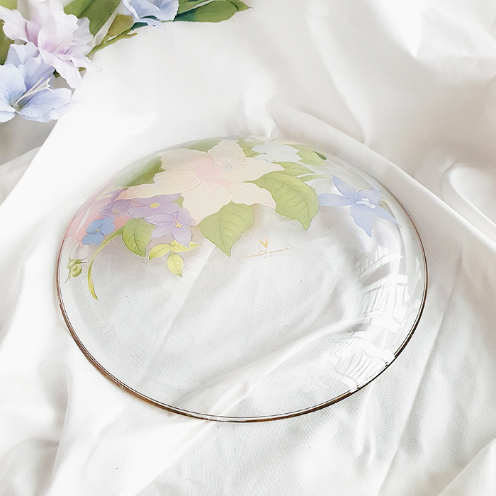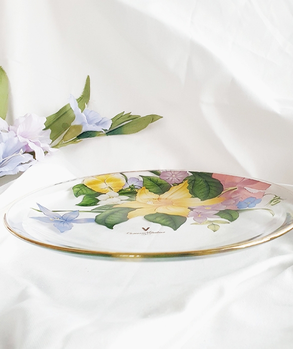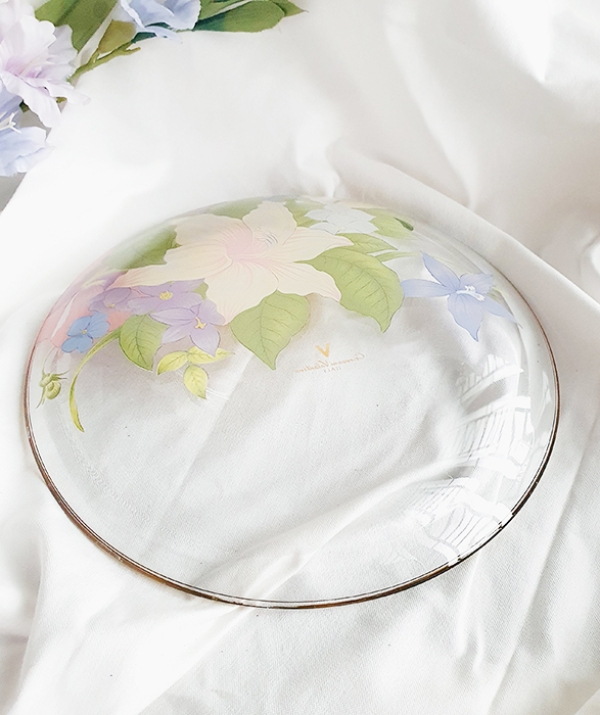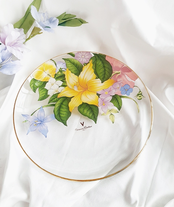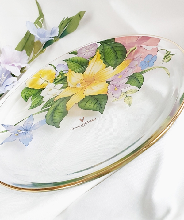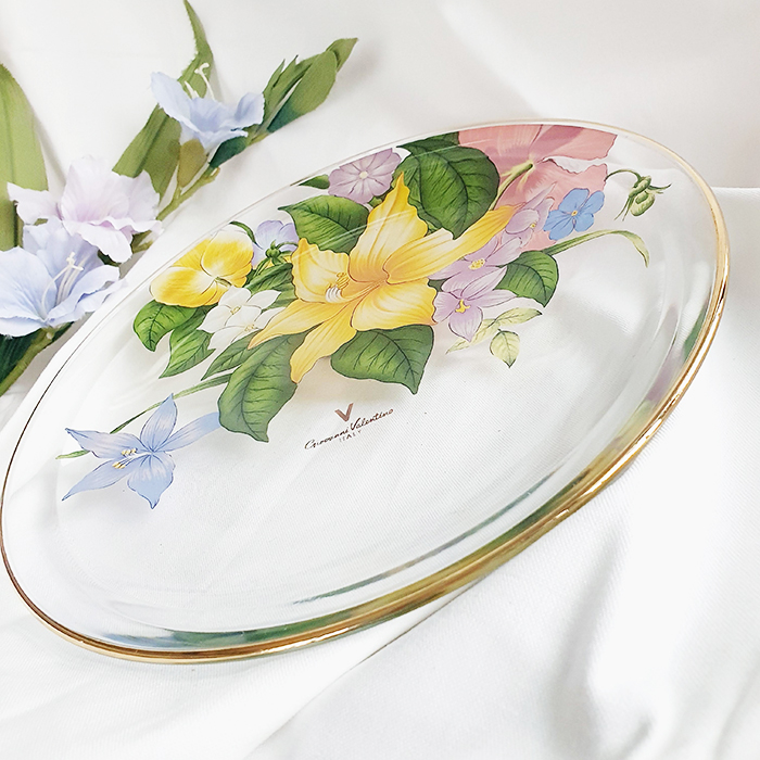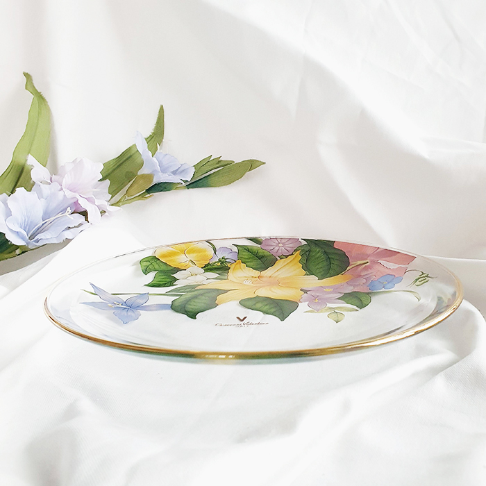 Dĩa to thủy tinh họa tiết hoa viền vàng dày rất đẹp và sang hiệu Valentino của Ý