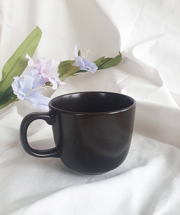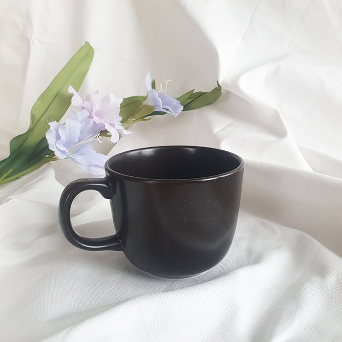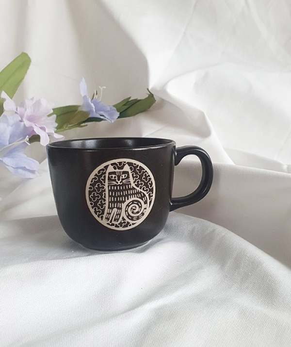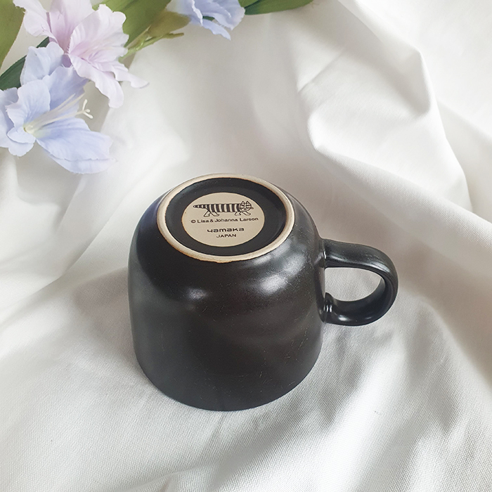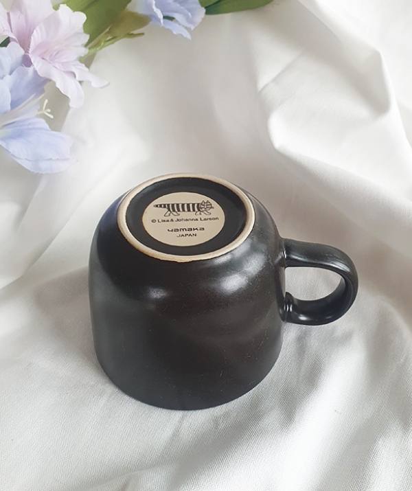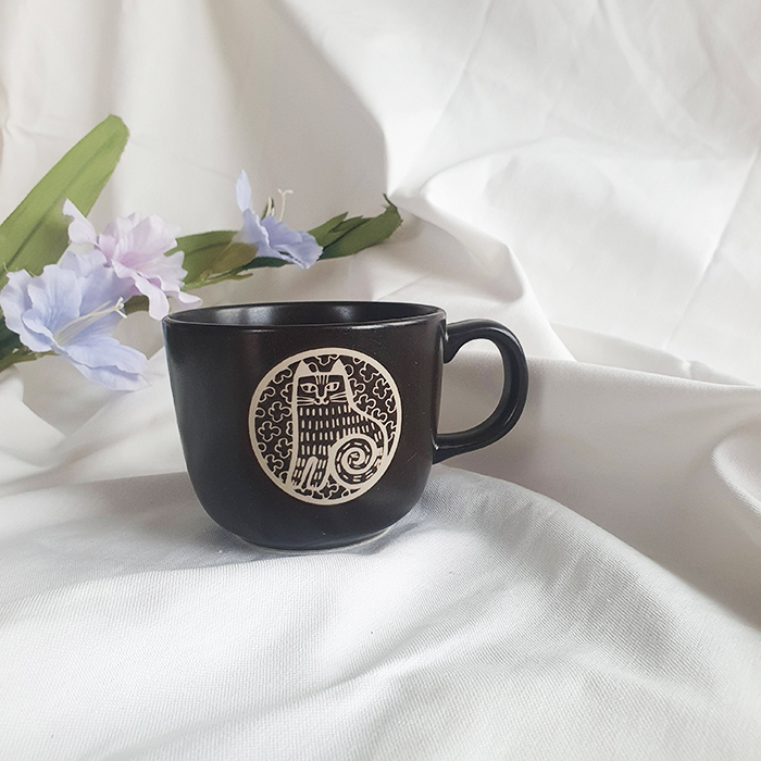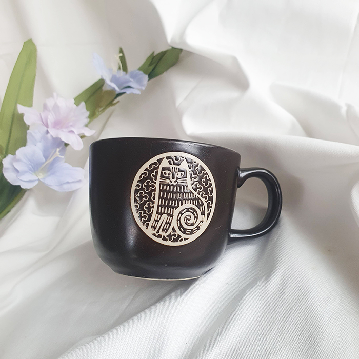 Ly sứ men nâu sẫm có họa tiết hình con mèo với phong cách thiết kế đặc trưng của nghệ sĩ gốm sứ người Thụy Điển Lisa Larson.