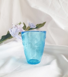 Ly thủy màu xanh dương khắc nổi hoa và cá quanh thân rất đẹp